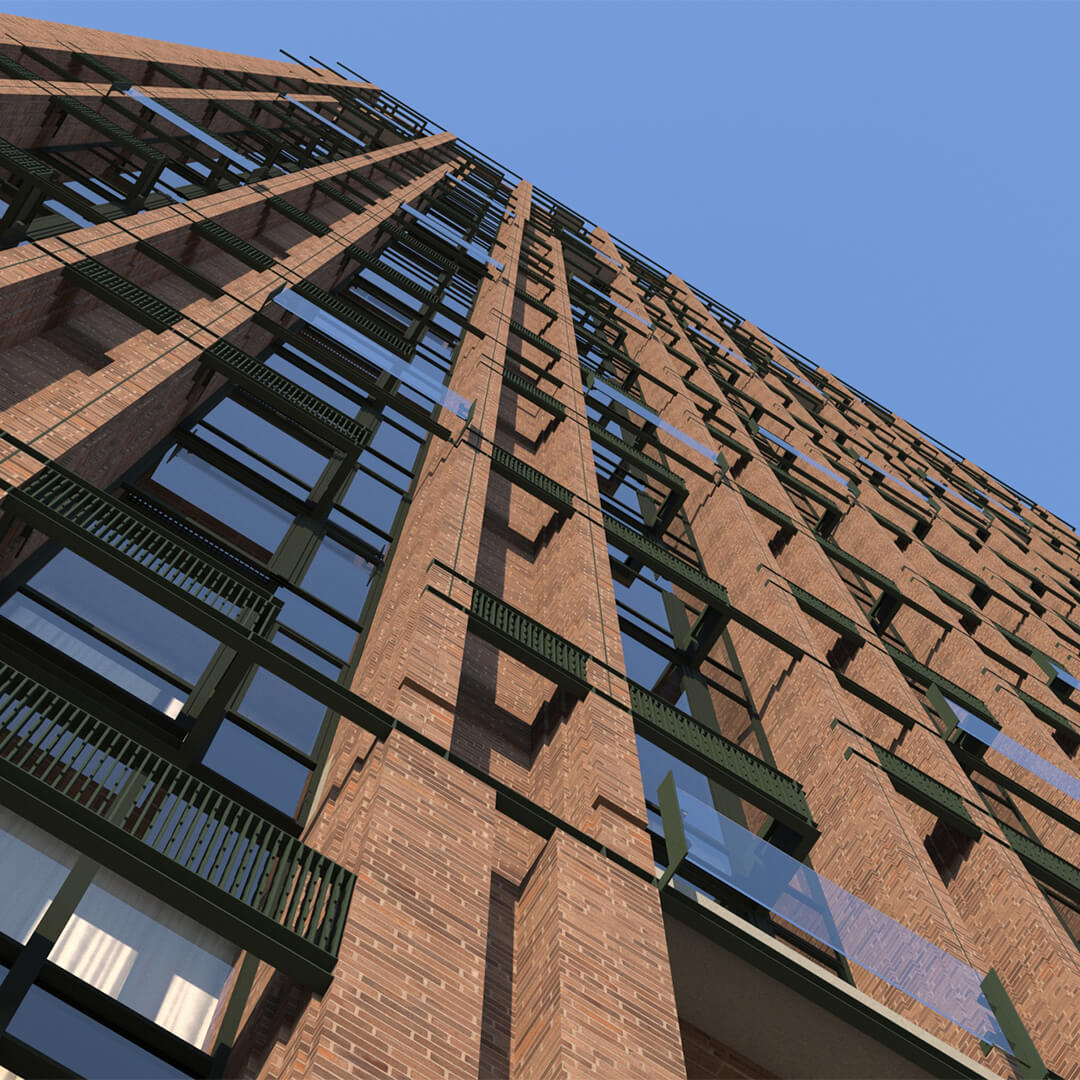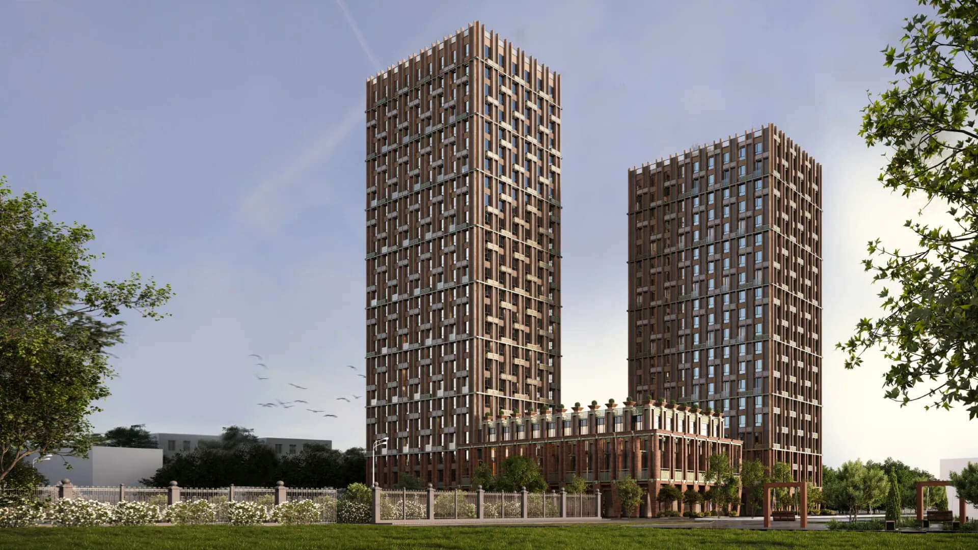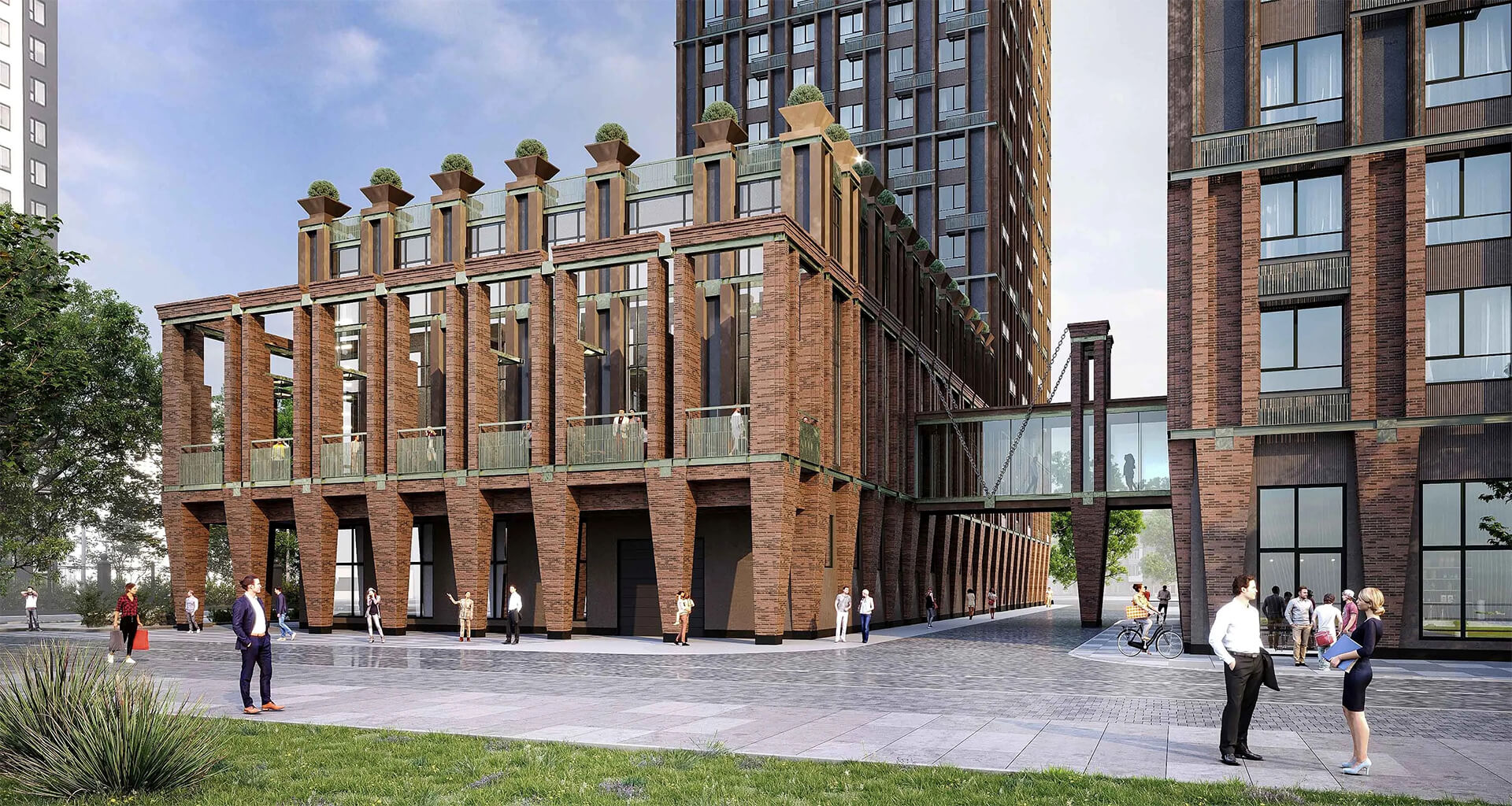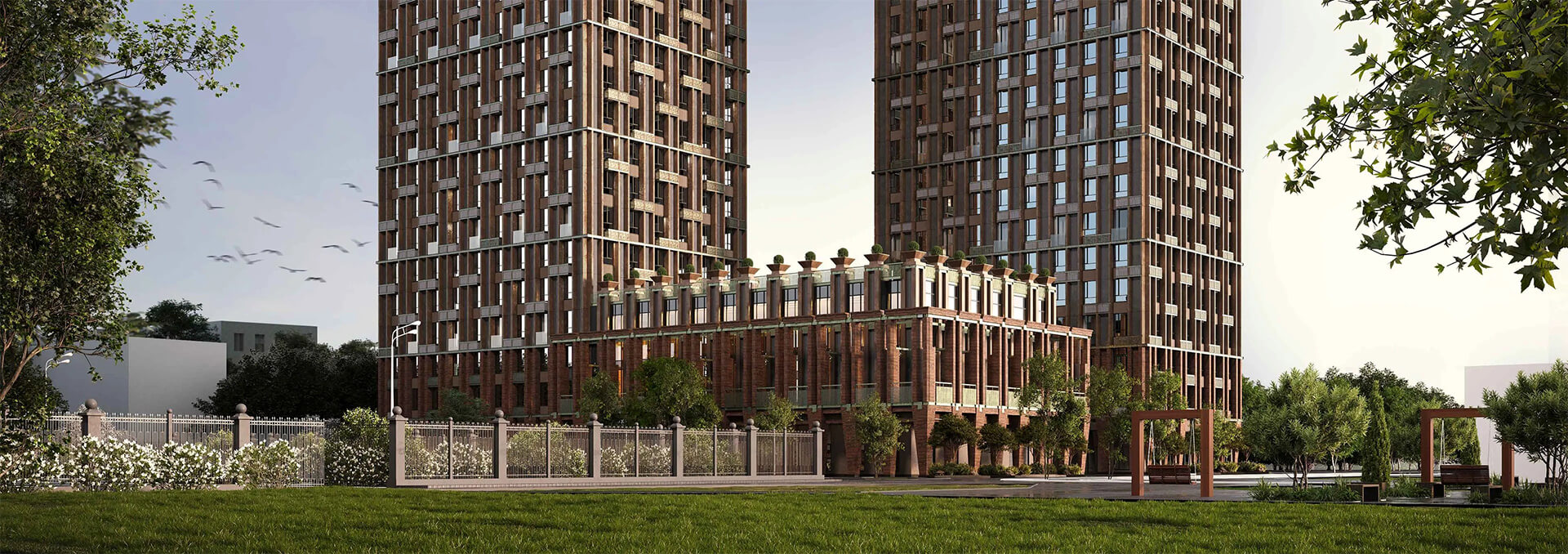 Особое внимание уделено деталям: стеклянный мост между башнями, ландшафтное озеленение и витражные окна подчёркивают уникальность архитектурного решения.